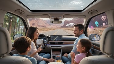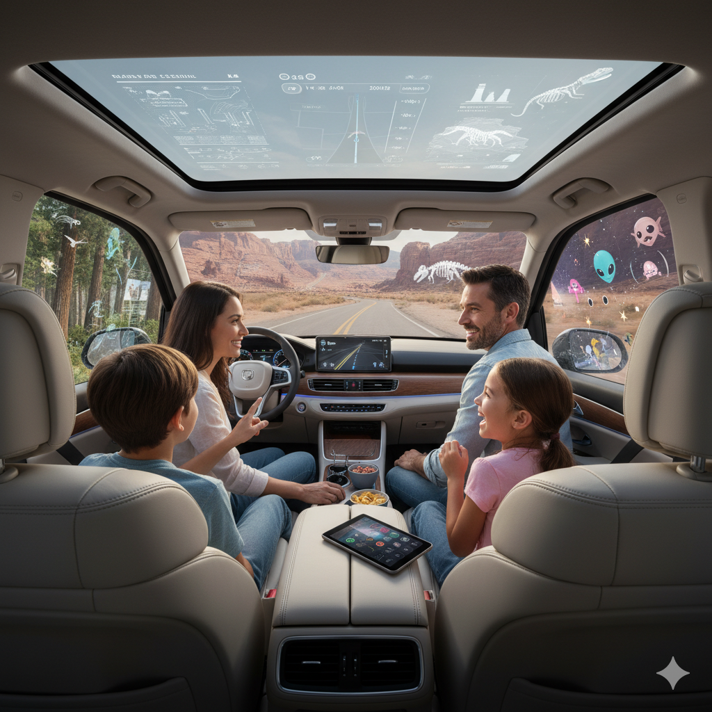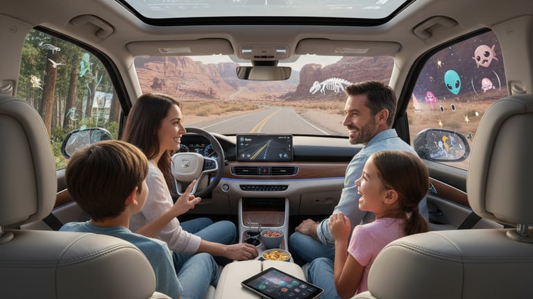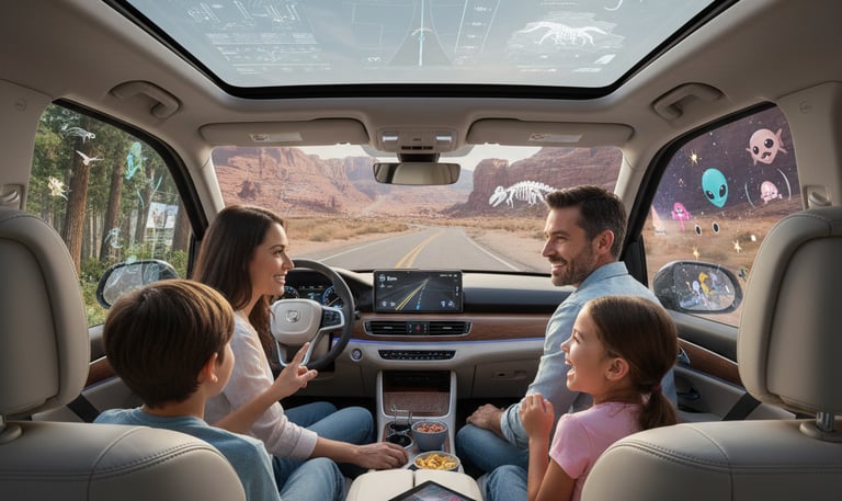 How might we design the future of family road trips to feel less like a long commute and more like an immersive, collaborative experience that turns the vehicle's windows and cabin into a dynamic entertainment canvas?